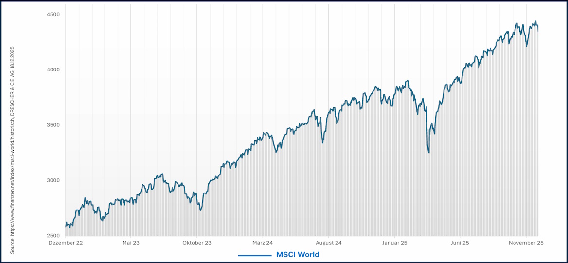 Man kann sich nur wundern. Das Jahr 2025 bescherte der Menschheit viel Unerfreuliches – ganz überwiegend selbstgemachtes und vorsätzliches Leid wie beispielsweise den anhaltenden Krieg Russlands gegen die Ukraine. Trotzdem kletterten die Aktienmärkte das dritte Jahr in Folge. Nachdem 2023 und 2024 gemessen am MSCI-Weltaktienindex Aktienrenditen von über 20 Prozent möglich waren, fiel 2025 das Plus mit 5 bis 6 Prozent bescheidener aus. Das lag aber nicht am US-Aktienmarkt, sondern daran, dass die dort erzielbaren Gewinne bei der Umrechnung in Euro zusammenschrumpften.