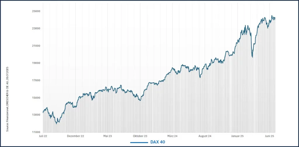 An den Märkten gewann das Thema der US-Importzölle mit dem Näherrücken des Monats August wieder an Bedeutung. So hatte die Trump-Administration Strafzölle angedroht, wenn bis Ende Juli keine Einigung erzielt werde. Zwischenzeitlich nahmen die Sorgen zu. Trump drohte mit hohen Importzöllen gegen Kanada, Brasilien und auf Kupfereinfuhren. Die Unsicherheit bescherte der Wall Street zwischenzeitlich Kursverluste. Dann aber wurde ein „Zoll-Deal“ mit Japan von den Börsen positiv aufgenommen. Gegenseitige Zölle von 15 Prozent und massive Investitionszusagen der japanischen Industrie führten insbesondere am japanischen Aktienmarkt und bei Auto-Aktien zu einem Kurssprung. So stieg beispielsweise die Aktie von Toyota Motor um 12 Prozent. Aber auch in Europa, das auf eine ähnliche Kompromisslösung hofft, zogen vor allem die Aktienkurse der Autobauer an. Der Euro-STOXX-50 blieb in seiner Seitwärtsbewegung zwischen rund 5.200 und 5.470 Punkten und damit in einer Bandbreite, die schon im Mai entstanden war. Der Deutsche Aktienindex DAX markierte im Juli dagegen ein neues Rekordhoch bei 24.639 Zählern über den Hochs vom Juni.