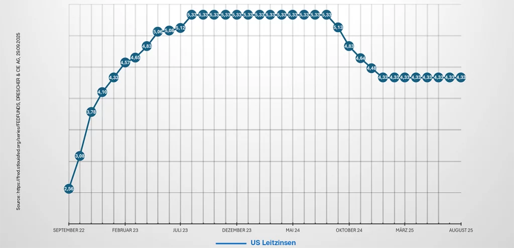 Die US-Notenbank Federal Reserve (Fed) senkte ihren Leitzins deshalb wie mehrheitlich erwartet um 0,25 Prozentpunkte auf die Spanne von 4,0 bis 4,25 Prozent. Damit reagiert sie auf die zunehmende Schwäche am amerikanischen Arbeitsmarkt. Weitere Leitzinssenkungen gelten als wahrscheinlich. Längerfristige Sorgen um die Unabhängigkeit der US-Notenbank, die nicht den Anweisungen der Regierung unterworfen sein soll, traten gegenüber den kurzfristigen positiven Wirkungen der Leitzinssenkungen in den Hintergrund. Niedrigere Zinsen begünstigen die Bewertung von Aktien, insbesondere von Wachstumswerten, bei denen die großen Gewinne in fernerer Zukunft erwartet werden.