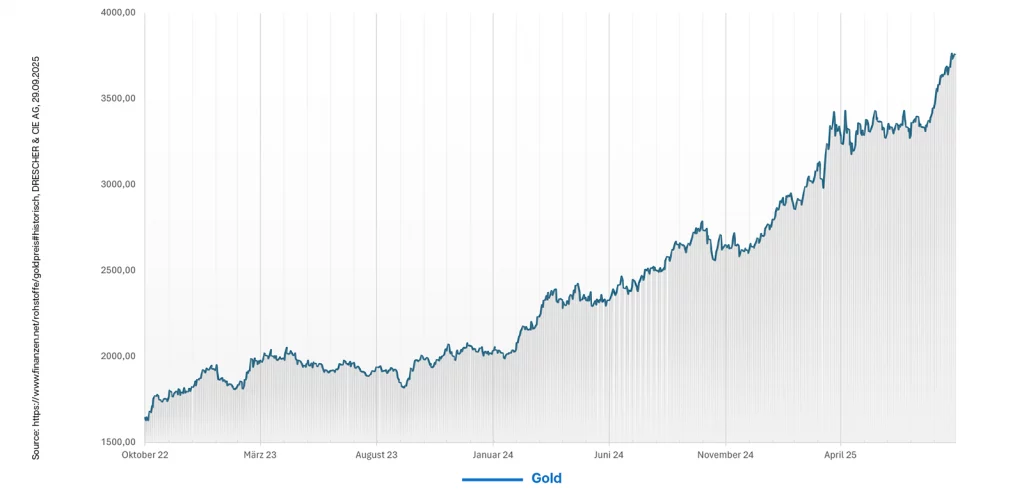 Der Goldpreis ist seit Mitte August um weitere 15 Prozent gestiegen. Im September wurden für eine Unze erstmals über 3.700 US-Dollar bezahlt. Gegenüber dem Goldpreis vom Jahresbeginn bei 2.624 US-Dollar ist das ein Anstieg um 43 Prozent. Auch der Silberpreis beschleunigte in den vergangenen Wochen seinen Aufwärtstrend. Gut 45 US-Dollar pro Unze bedeuten für das laufende Jahr einen Anstieg um 55 Prozent. Und der Platinpreis erhöhte sich gegenüber Jahresbeginn sogar um 69 Prozent auf 1.535 US-Dollar pro Unze.